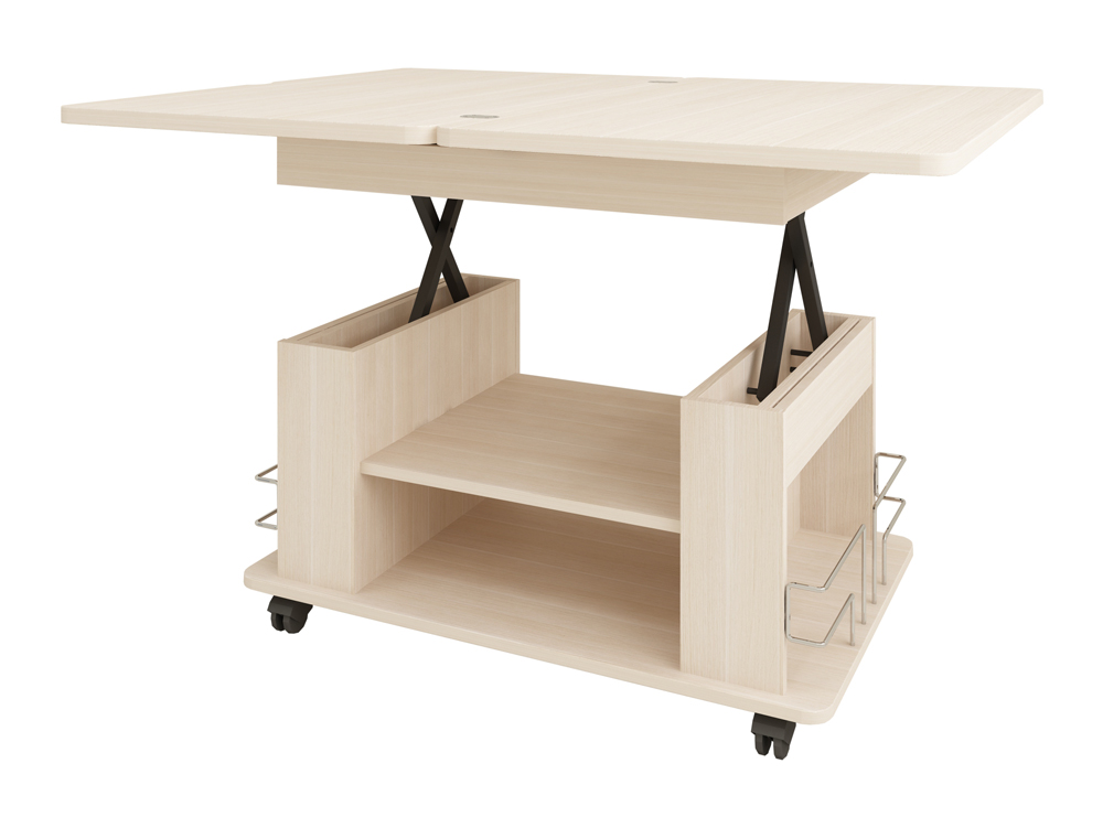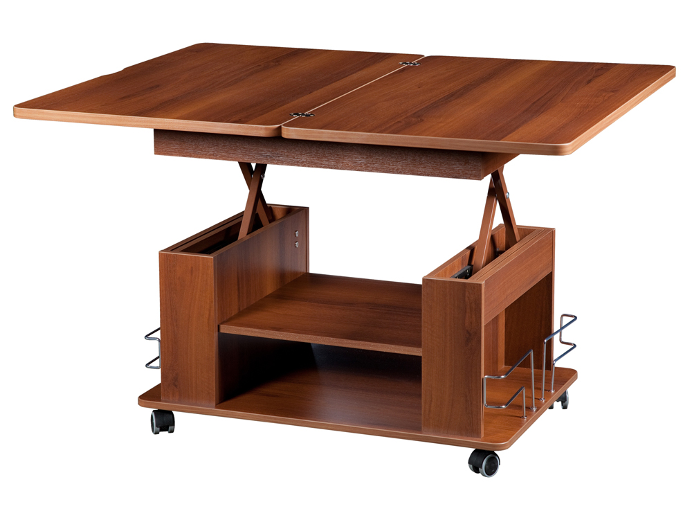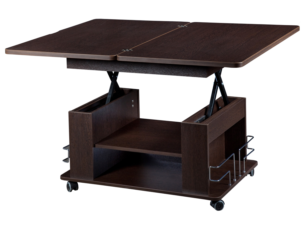 «Агат 23» – это многофункциональная модель, которая сочетает в себе функции журнального и обеденного стола. Cтолешница легко поднимается до высоты 75 см за счет механизма подъема и увеличивается вдвое – благодаря поворотному механизму.