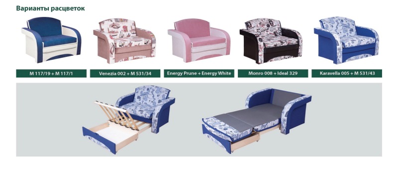 В основе дивана – каркас с поддерживающими латами и механизмом трансформации типа «аккордеон». Спальное место образуется следующим образом: сиденье выдвигается в перед, спинка, состоящая из сложенного листового пенополиуретена, раскладывается. Настил мягких элементов выполнен из эластичного пенополиуретана не ниже 25 плотности. Имеется емкость для хранения постельных принадлежностей.