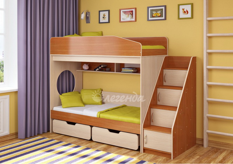 Над нижним спальным местом располагается встроенная двухсекционная полка, в которой удобно хранить книги, учебники, тетради, канцелярию и другие нужные вещи.