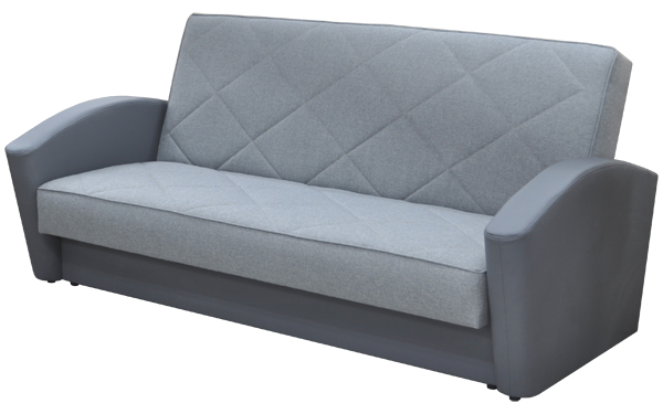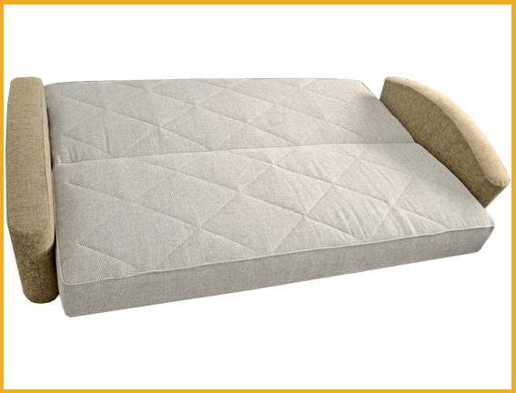 Ровное спальное место. Боковины дугообразной формы. Для трансформации дивана требуется расстояние между стеной и диваном. В основании короба имеется емкость для хранения постельных принадлежностей. Сиденье и спинка сформированы на основе деревянных рамок, на которые кладется матрас, состоящий из пружинного блока с настилом из  термовойлока и эластичного листового пенополиуретана, соединенных между собой механизмом трансформации «книжка».