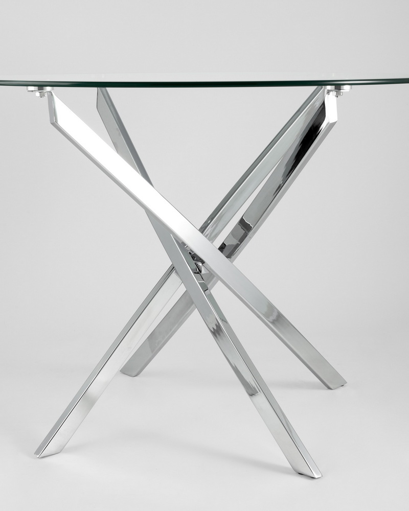 Стеклянный обеденный стол Ходро 90 с дизайнерскими оригинальными ножками из хромированного металла. Столешница выполнена из качественного закаленного стекла.