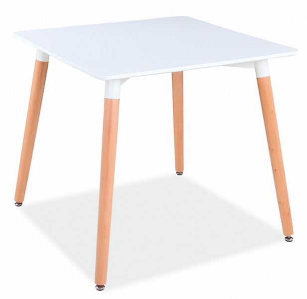 Столешница ярко-белого цвета изготовлена из МДФ, эффектно сочетается с деревянными ножками, которые оформлены в естественной цветовой гамме.