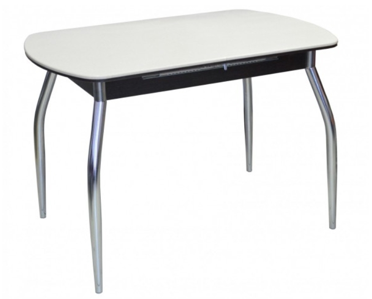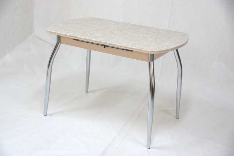 Раздвижной стол "Турин-1" (пр-во Россия). Комбинированная столешница: ЛДСП 10 мм и искусственный камень 12 мм. Центральная вставка - "бабочка" шириной 32 см позволяет легко разложить стол до размеров 70х142 см. Искусственный камень естественных расцветок является ударопрочным и практичным материалом. Полированная поверхность камня обладает мягким блеском. Торец ЛДСП облицован ПВХ-кромкой.